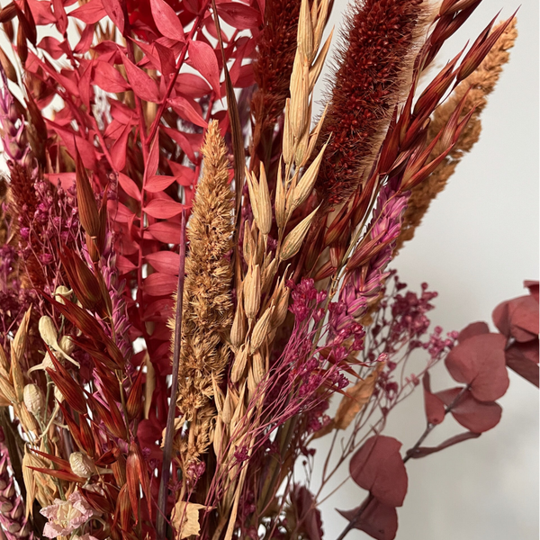 Droogboeket Valentijn is een liefdevol boeket, speciaal ontworpen voor Valentijnsdag. Het droogboeket beschikt over prachtige droogbloemen in rode en roze tinten, zoals gepreserveerde Ruscus en Eucalyptus en fluffy Pampas.