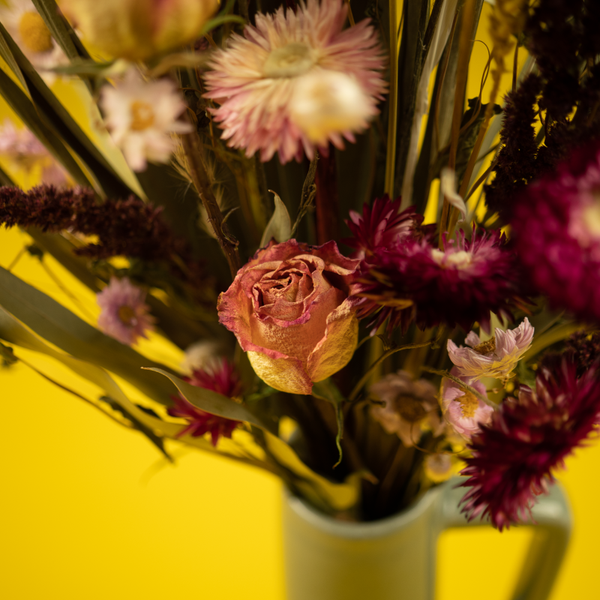 Een prachtig romantisch boeket, in de kleuren oud roze, geel, bruin en groen. Het boeket is eenzijdig geschikt, waardoor het mooi uitkomt op een kastje of tegen een muur. Vaastip: een vaas met een smalle opening, bijvoorbeeld Flesvaas Glas.