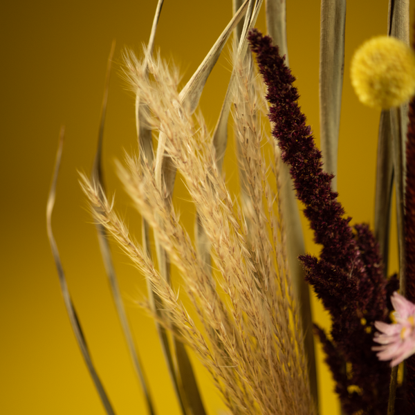Boeket Avondgloed bevat: Chamaerops, Amaranthus, Babala, Craspedia, Eucalyptus, Roos, Rodanthe, Helichrysum, Phalaris, gekleurde Triticum en Stipa pluim.