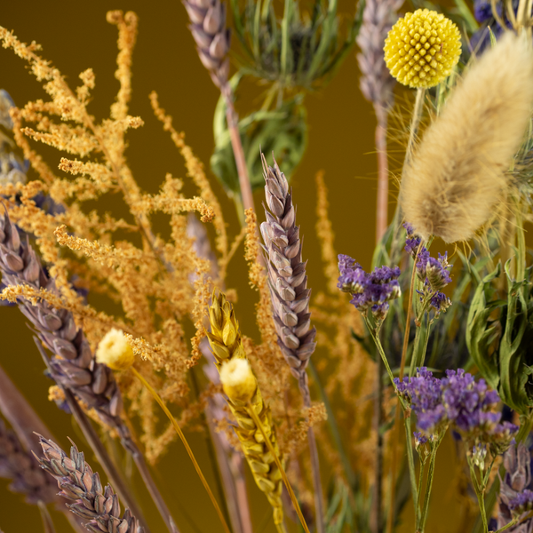 Droogboeket Lentepret is een lief pastelkleurig boeketje in frisse lentetinten. In de kleuren blauw, crème, geel en lila. Het boeket is rond geschikt, dus komt mooi tot zijn recht midden op tafel, waar je het van alle kanten kunt bewonderen.