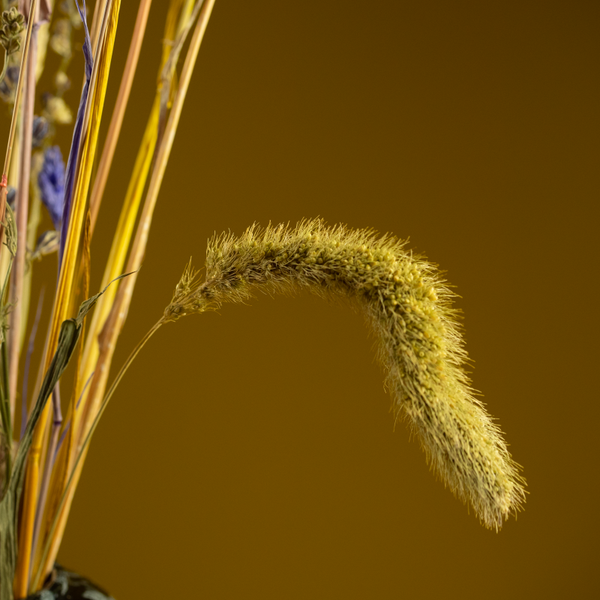 Droogboeket Plukgeluk is een fleurig boeket met fijne materialen en is niet te netjes geschikt, alsof het zo geplukt is. In de kleuren blauw, geel, roze, zalm, en paars.