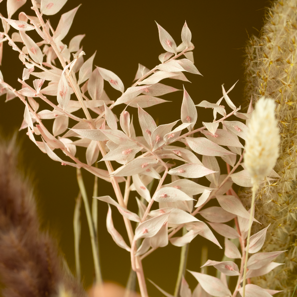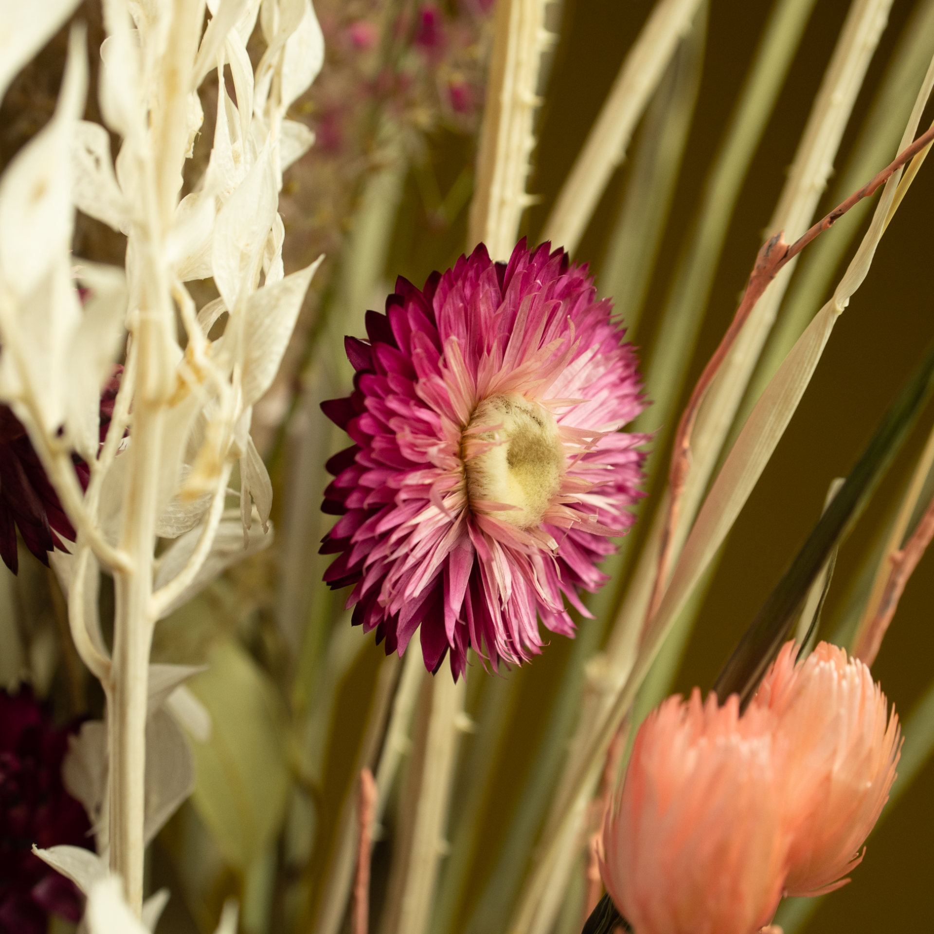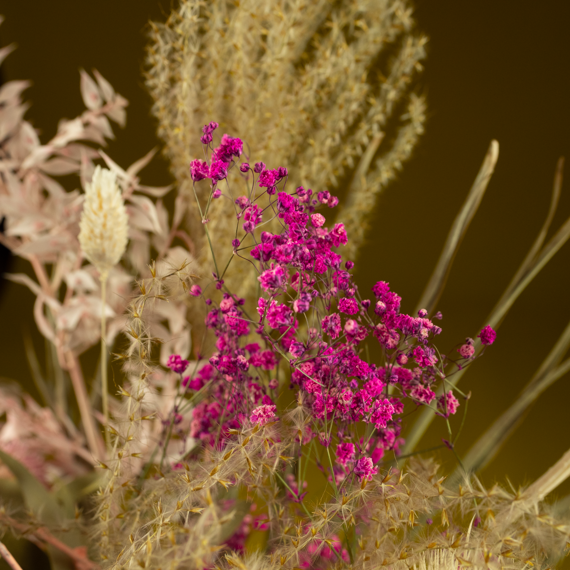 Dit boeket bevat: Chamaerops, Stipa pluim, Kardoen Distel, Gypsophila, Kaaps Everlasting, Helichrysum, gepreserveerd Ruscus roze en wit, Setaria, Eucalyptus, Babala, Phalaris, Berkentakjes.