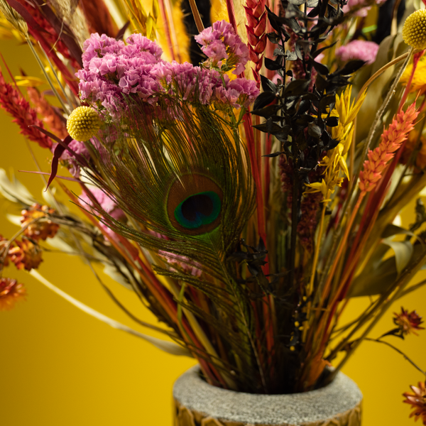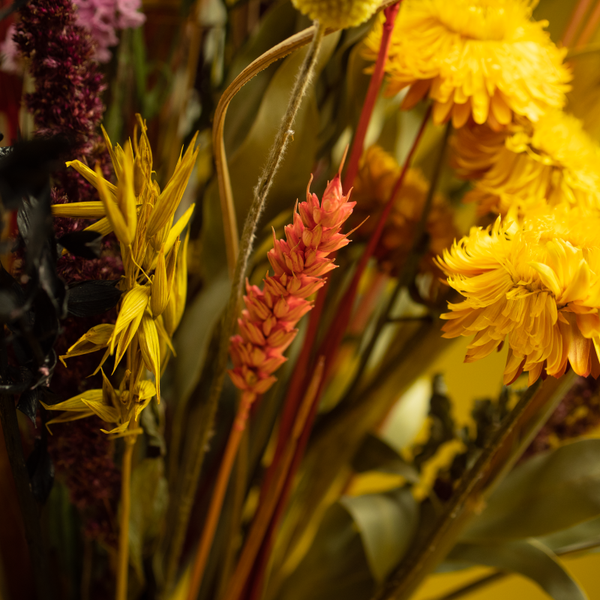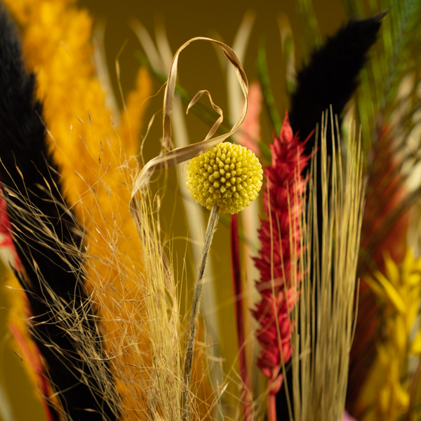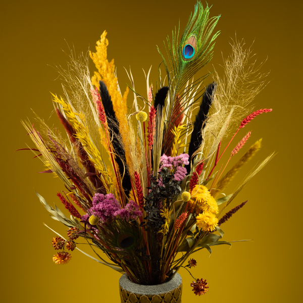 Dit boeket bevat: Chamaerops, Limoneum, Helichrysum geel en oranje, Pauwenveer, Pampas, gepreserveerde Parvifolia Eucalyptus, Craspedia, Hordeum, Amaranthus, Euca leaves, Triticum, gepreserveerde Ruscus, Avena Yellow, Curly ting ting en Fluffy pampas geel, bruin en zwart.
