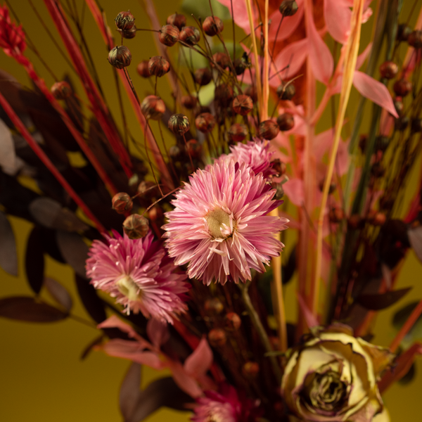 Droogboeket Lief Gebaar is een schattig en lief boeketje in roze en rode kleuren. De gekleurde Eucalyptus, Ruscus en Fluffy pluim geven het boeketje een extra touch. Het boeket is eenzijdig geschikt en komt goed tot zijn recht op een tafel of kast tegen de muur.