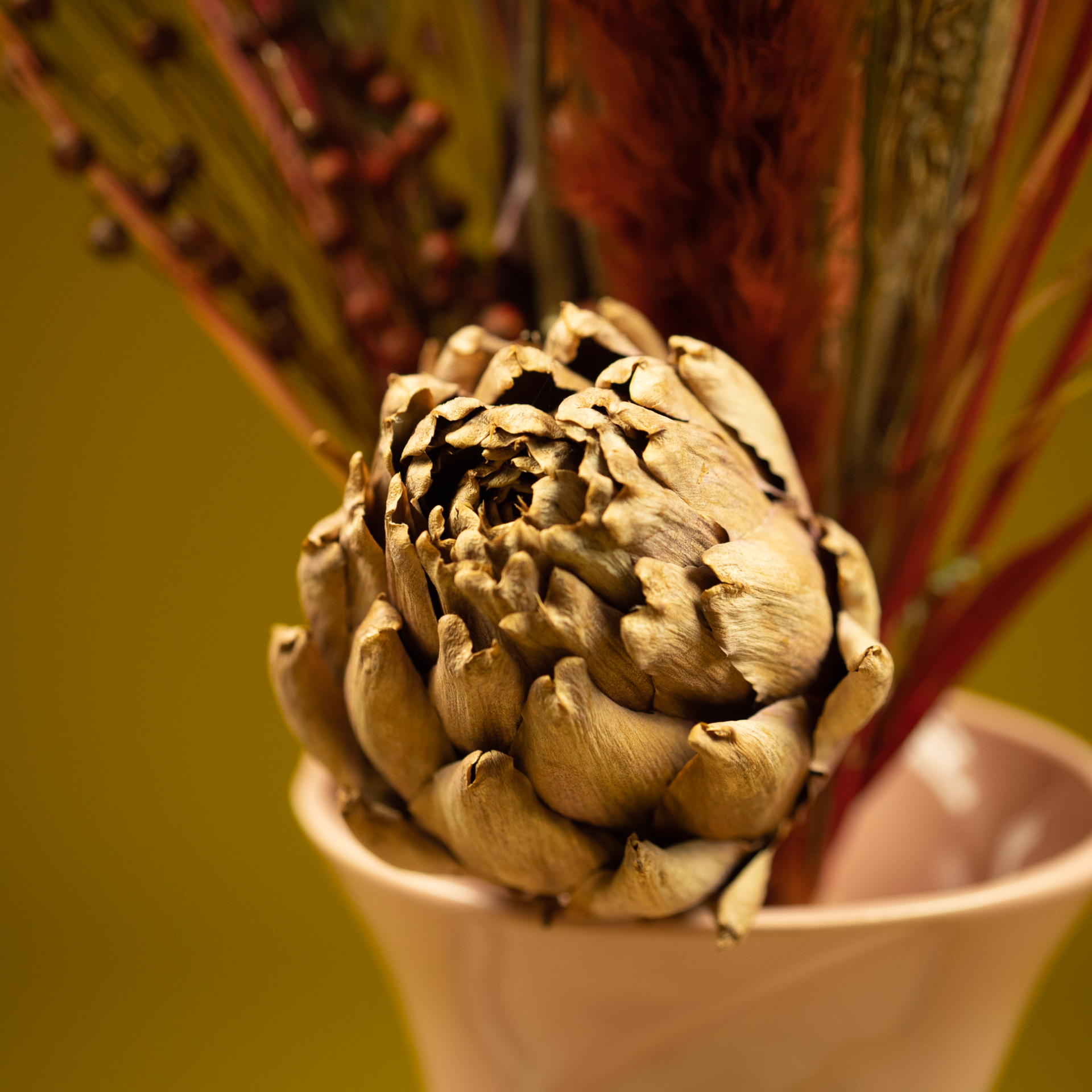 Droogboeket Liefde is een prachtig boeket in dieprode en roze tinten. Ideaal om aan een geliefde te geven. Het boeket bevat prachtige materialen zoals gedroogde Artisjok en Fluffy Pampas.