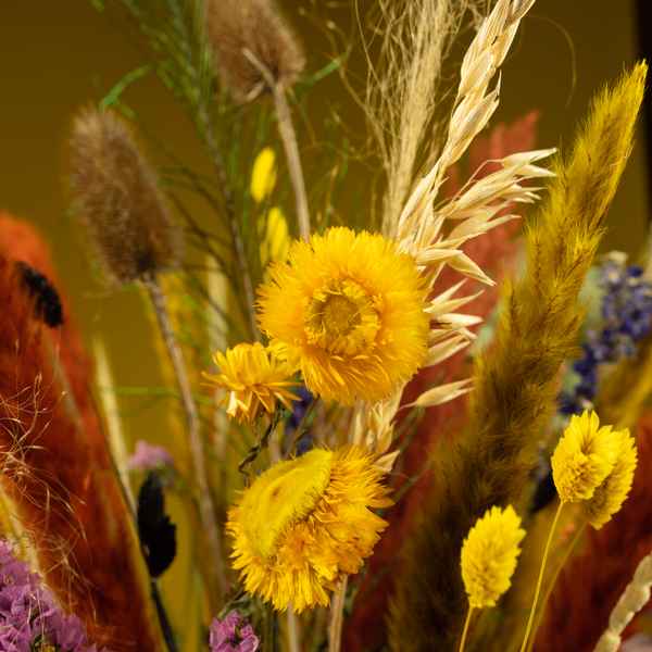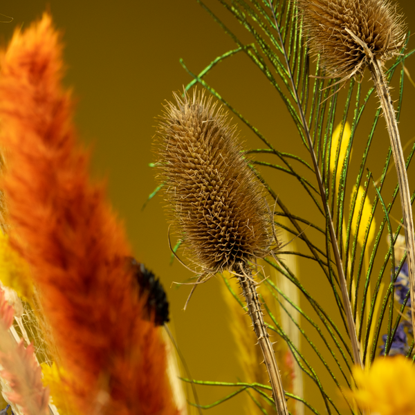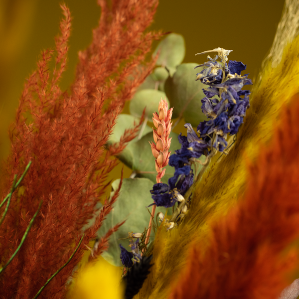 Dit boeket bevat: Eucalyptus groen en rood, Safari, Phalaris geel en zwart, Helichrysum geel Limoneum, Delphinium, Dipsacus, Fluffy pampas oranje en geel, Pampas, Babala, Triticum, Avena Frosted, Paleone gebleekt en Pauwenveer.