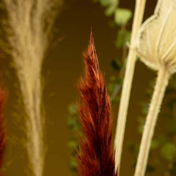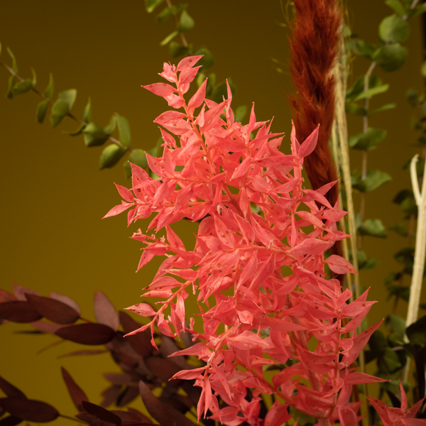 Droogboeket Weelderig bevat stuk voor stuk echte blikvangers! Door de gepreserveerde Ruscus en Eucalyptus blijft het boeket extra lang houdbaar. In de kleuren wit, groen, bruin, dieprood en roze. Het boeket is rond geschikt en komt daardoor op elke plek goed tot zijn recht.