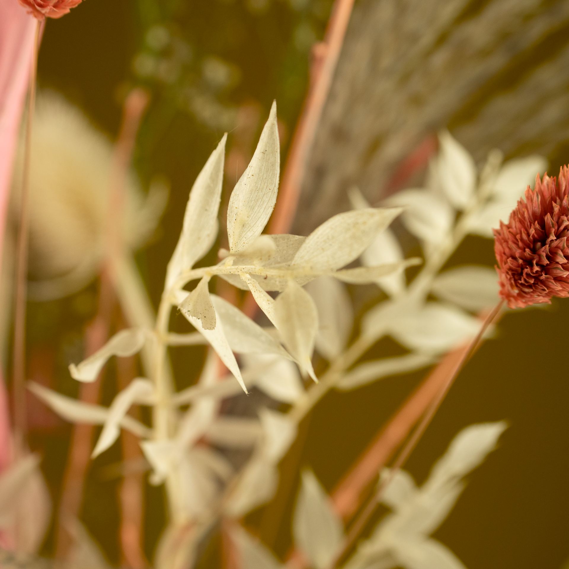 Droogboeket Roze Droom XL is een prachtige blikvanger in roze, wit en natureltinten en komt zowel midden op tafel als tegen een muur heel goed tot zijn recht. Het boeket bevat mooie materialen, zoals de Kardoen distel en gekleurd Strelitziablad.