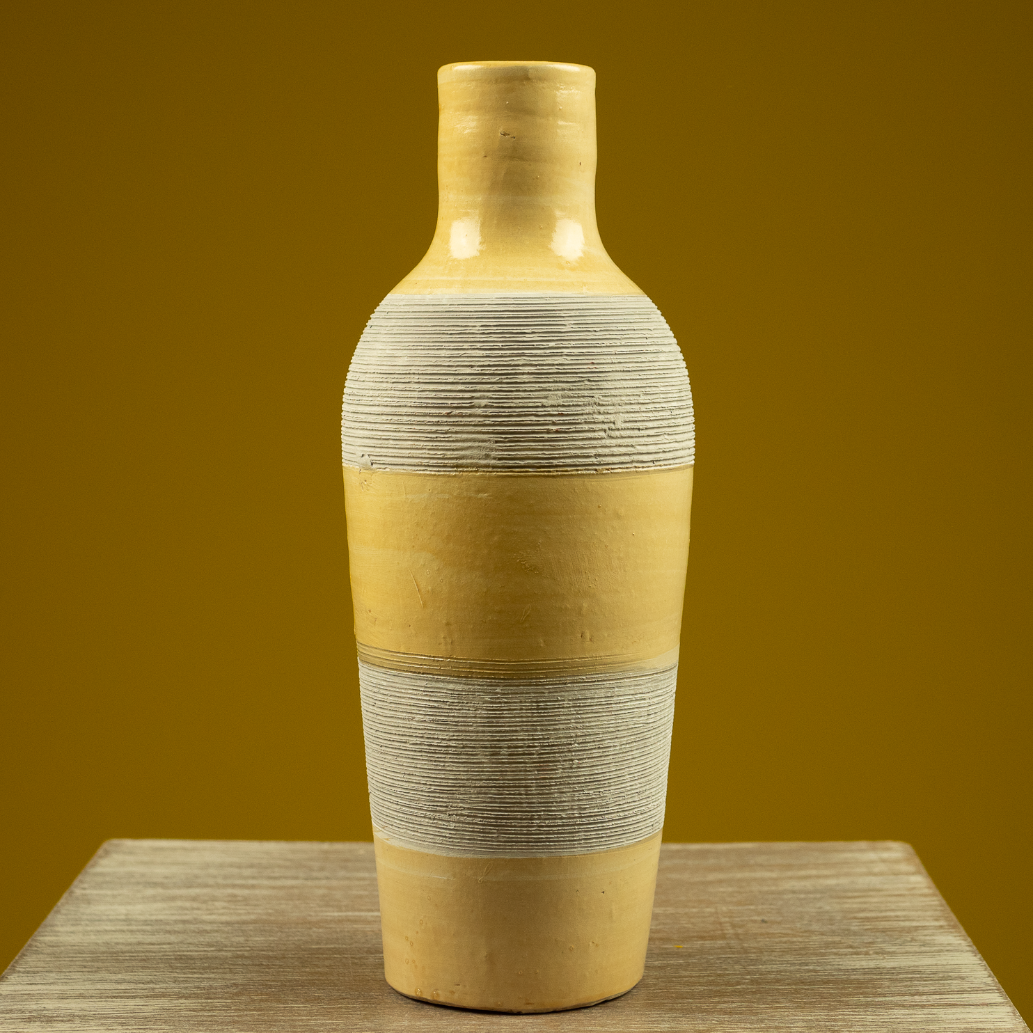 Lief Aardewerk vaasje met oker/grijs streepmotief. De hoogte van de vaas is 26 cm.