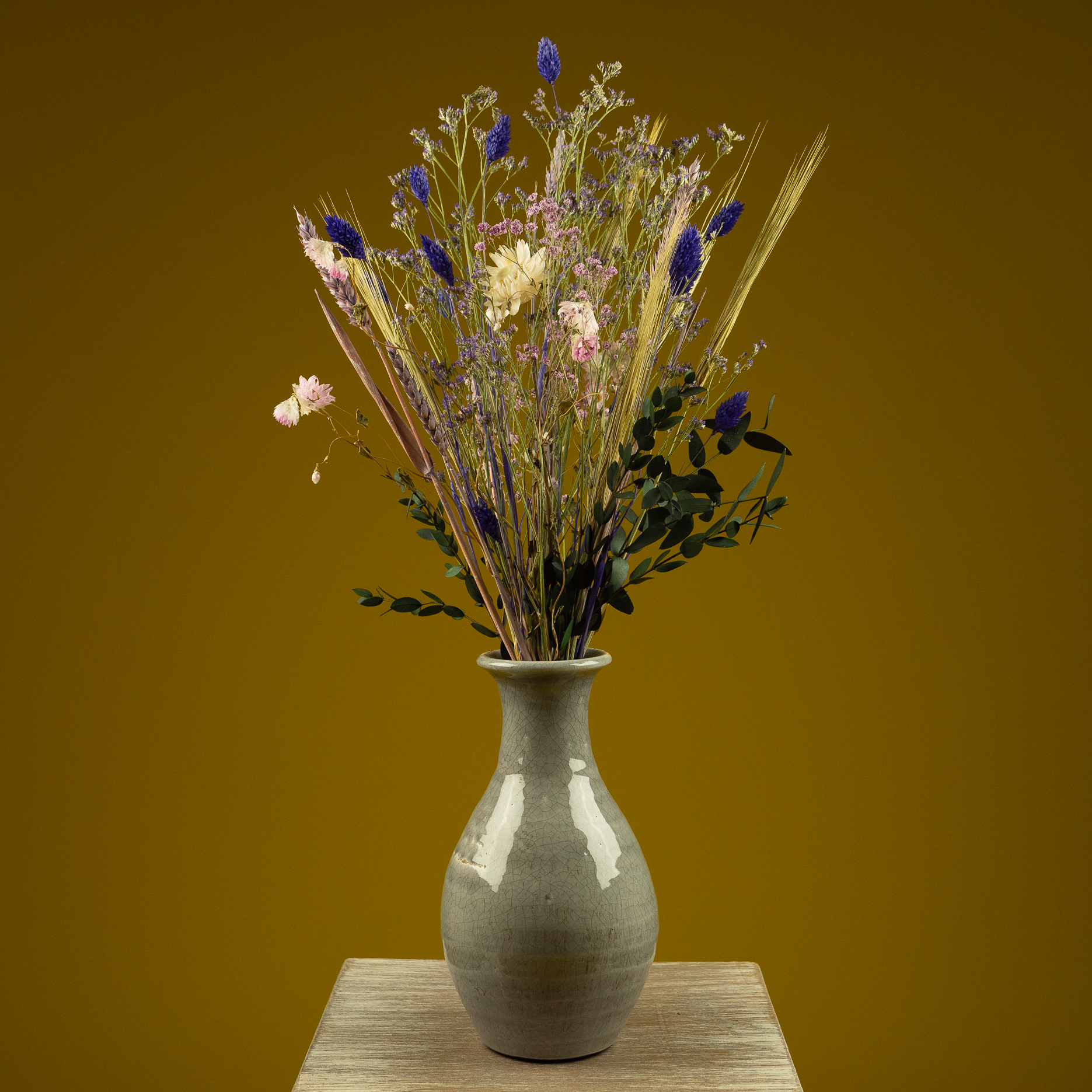 Naast het maken van droogboeketten, vind ik het heel leuk om te zoeken naar mooie tweedehands vazen in allerlei kleuren, vormen en maten. Dit maakt dat bijna elk exemplaar uniek is. Regelmatig wordt de voorraad weer aangevuld.