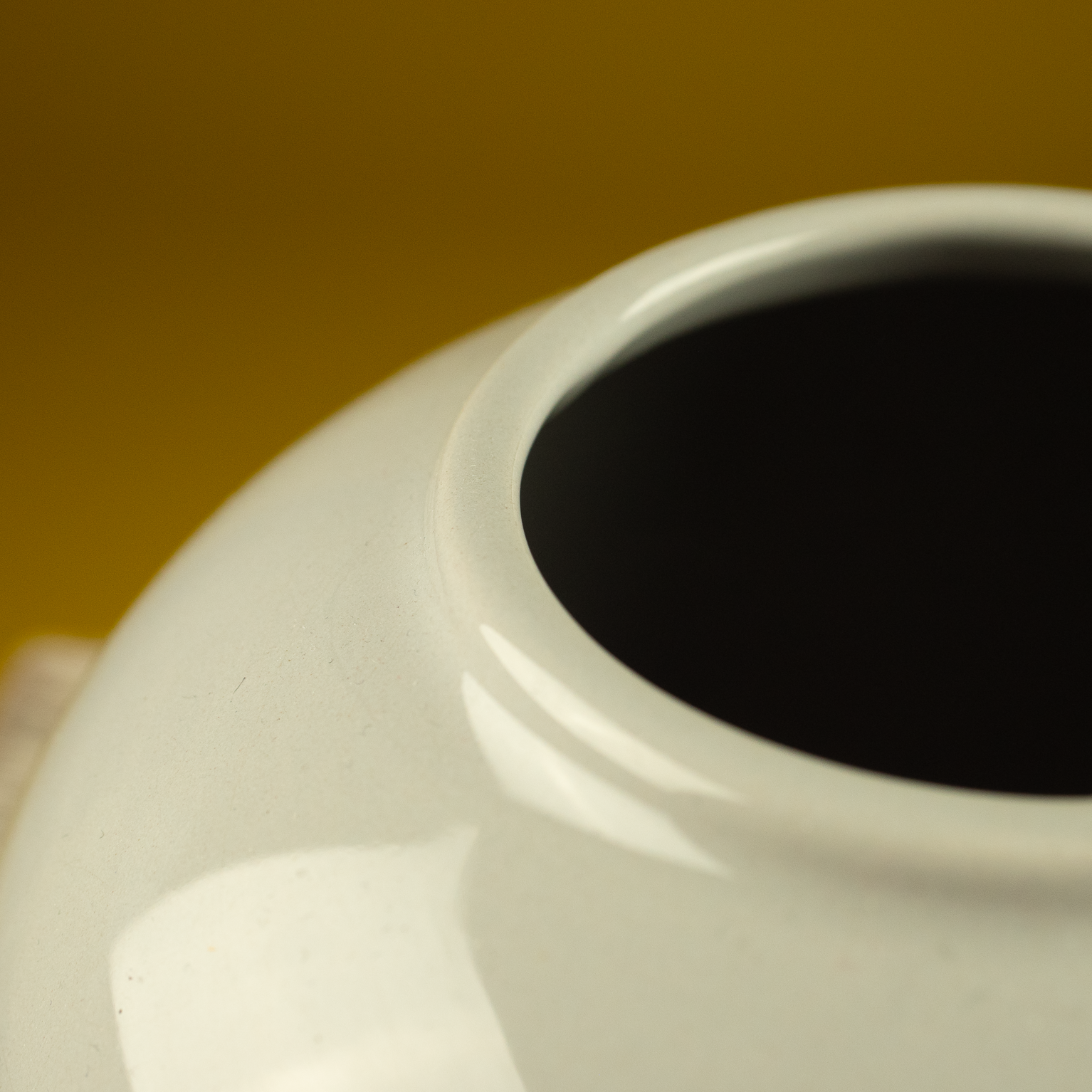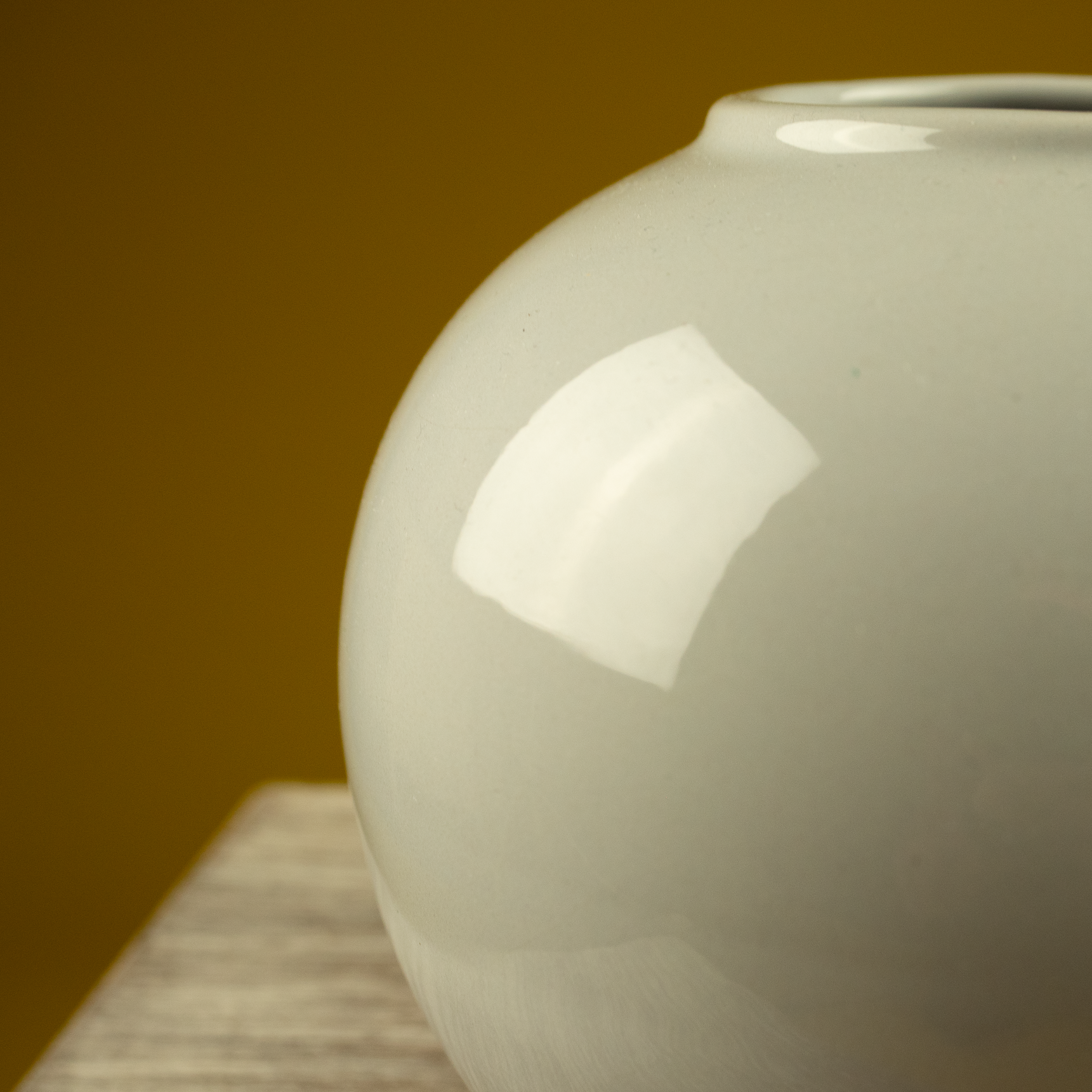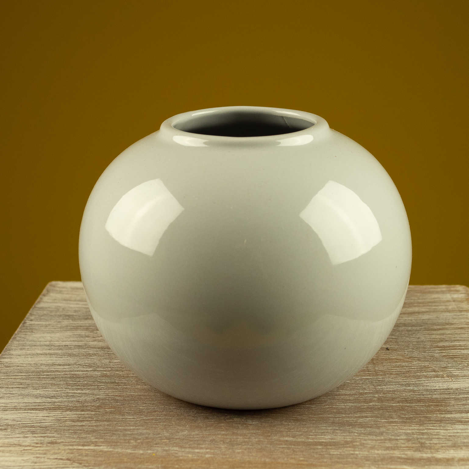 Lief grijs bolvaasje met een hoogte van 15 cm. Geschikt voor een wat kleiner droogboeket.