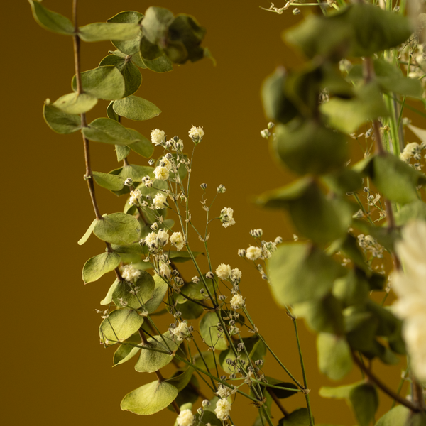 Dit boeket bevat: Eucalyptus Baby Blue, Helichrysum, gepreserveerde Ruscus, Stipa pluim, Gypsophila, Triticum en Kardoen Distel.