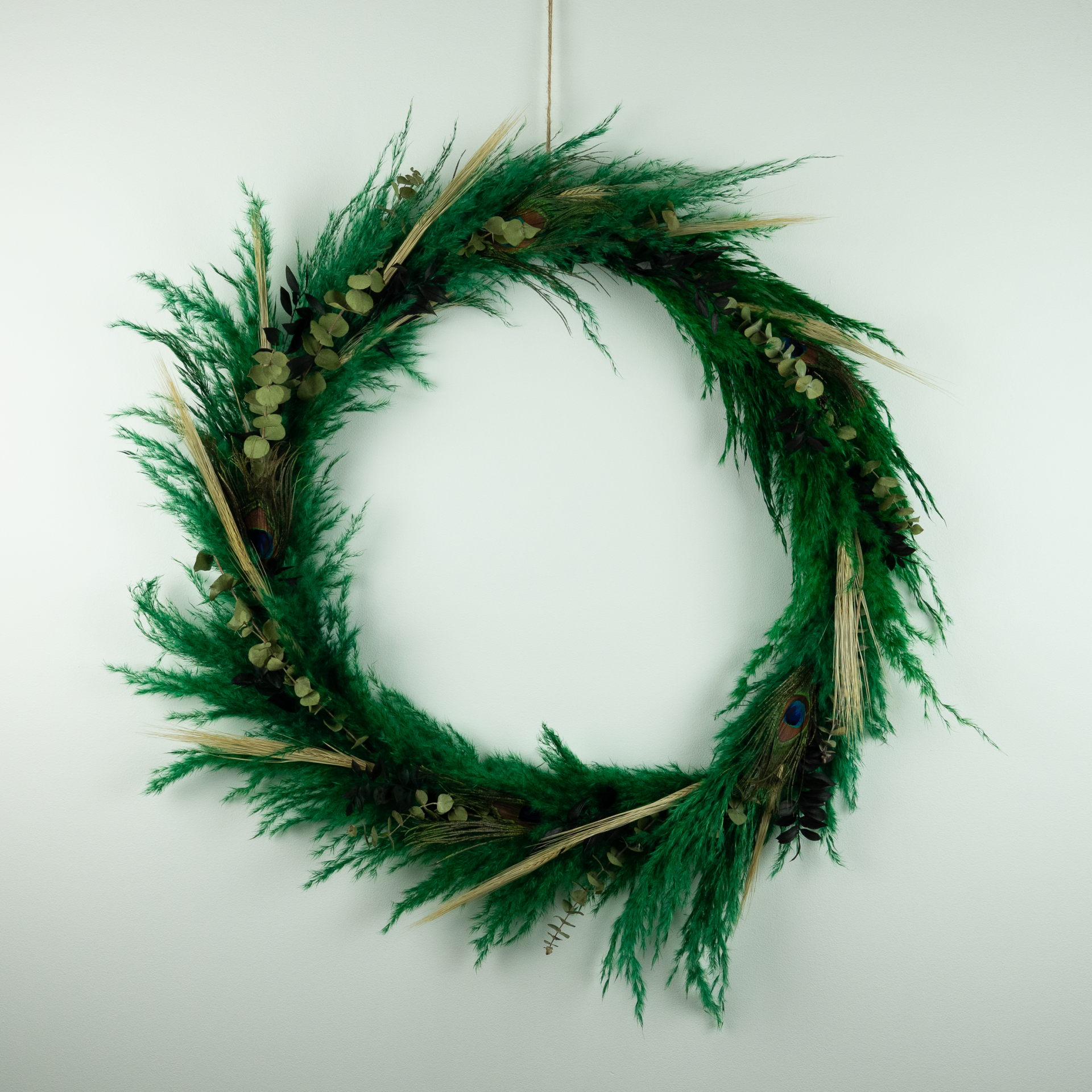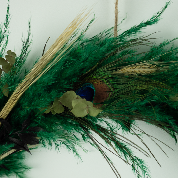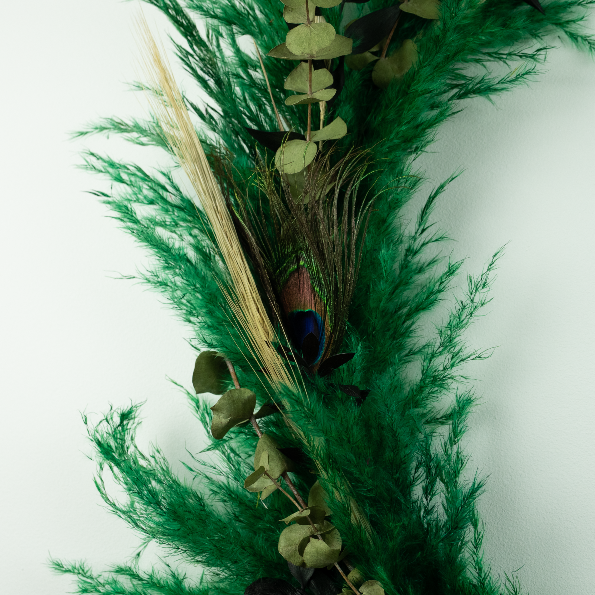 Droogkrans Groene Pampas is een weelderige, aaibare en rijkelijk gevulde krans die door de neutrale kleur in bijna elk interieur goed tot zijn recht komt. Door de pauwenveren heeft deze krans een luxe uitstraling.