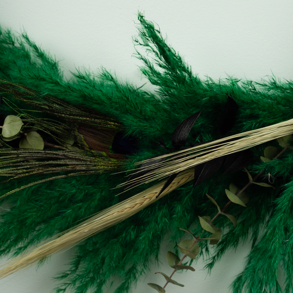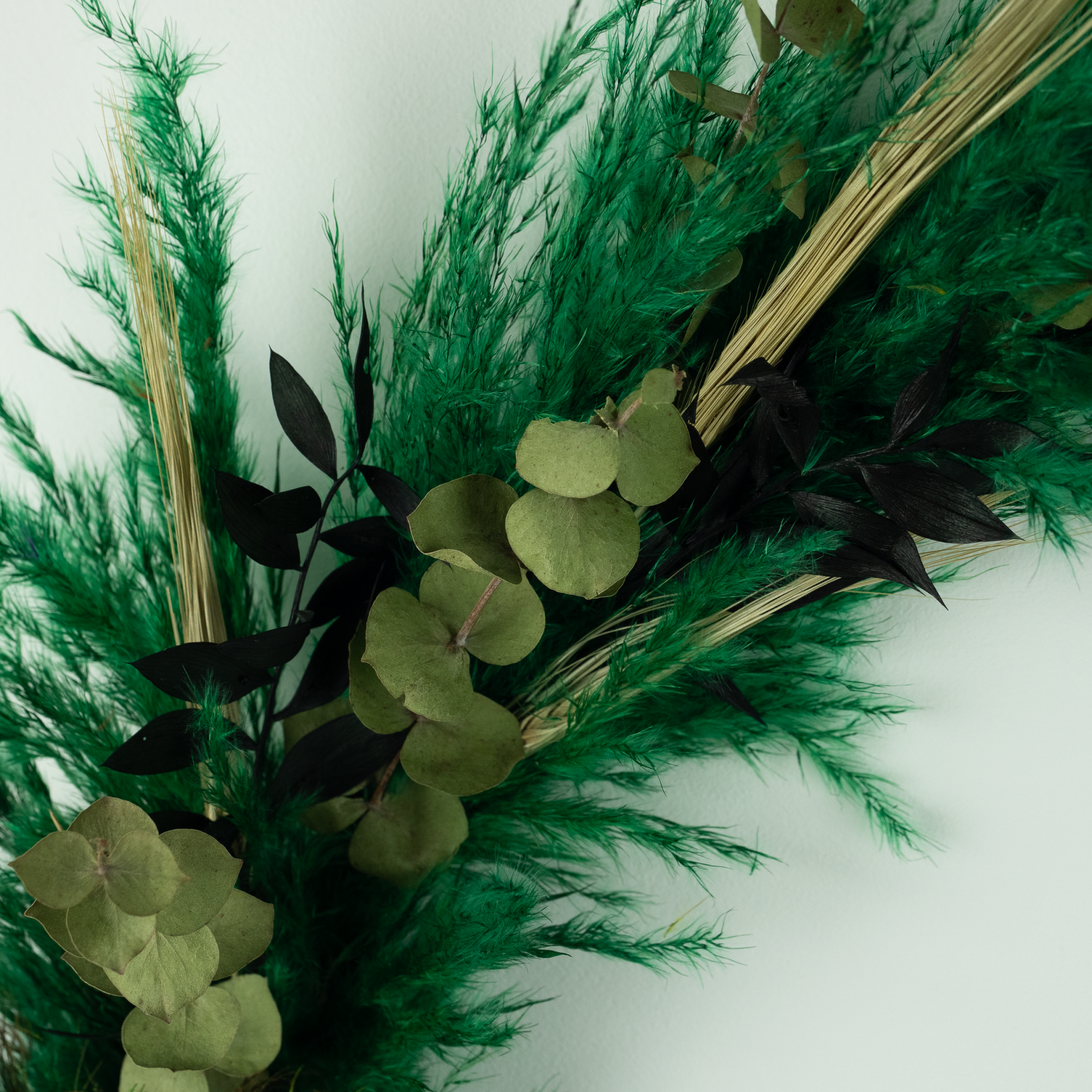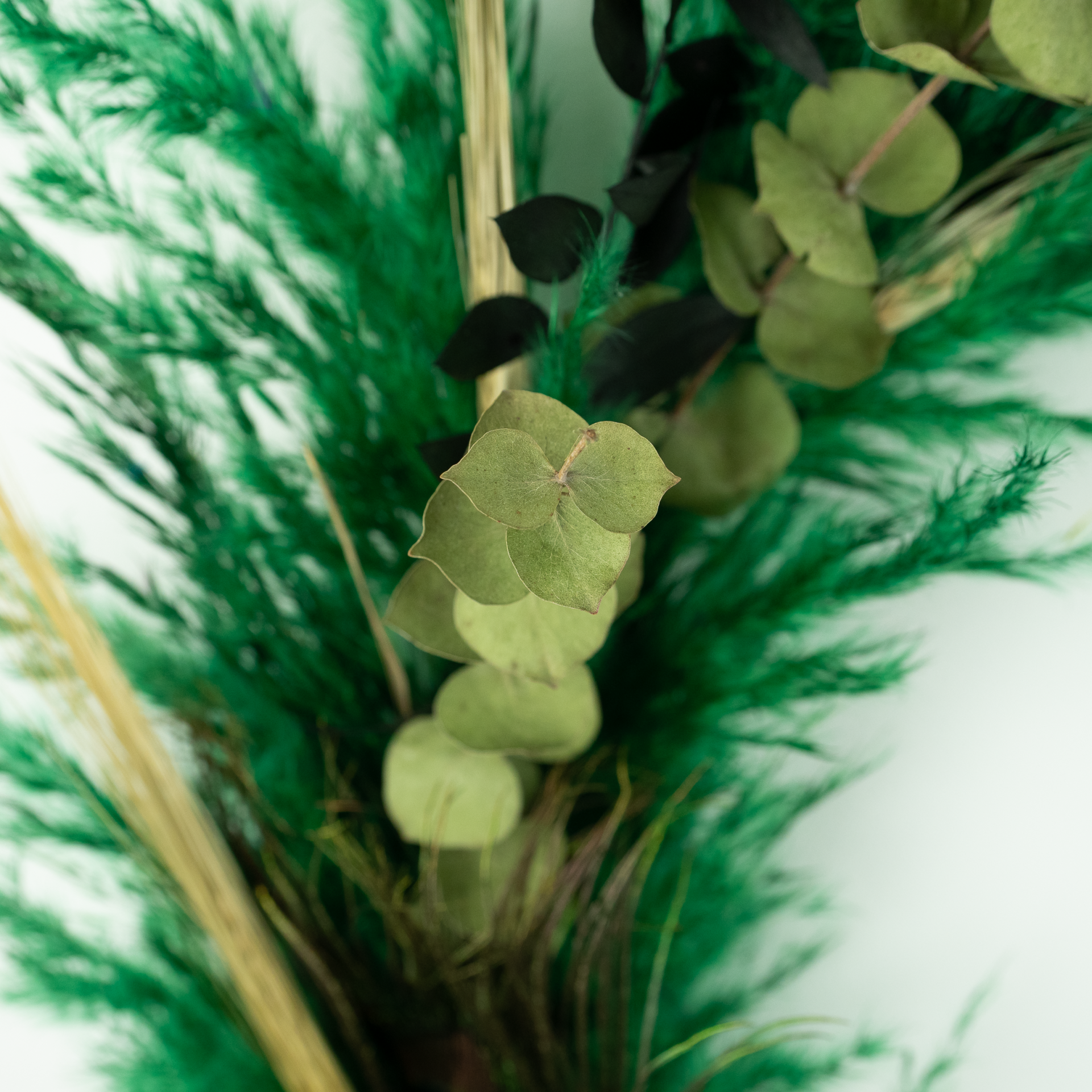 Dit boeket bevat: groene Pampas, Eucalyptus Baby Blue, pauwenveren, Hordeum en gepreserveerde zwarte Ruscus.