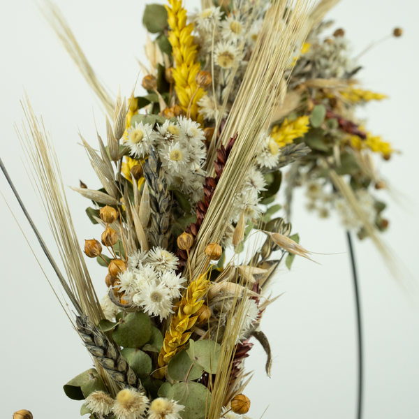 Voor de krans wordt gebruik gemaakt van een zwarte ring op voet. Er kan gekozen worden voor een krans met een diameter van 30 cm of 40 cm. Inclusief de droogbloemen is de krans op het gevulde gedeelte iets groter.