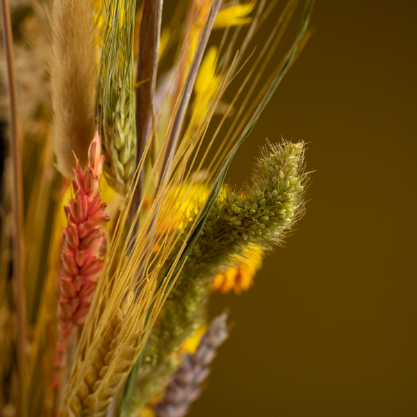 Dit boeket bevat: Chasmantium, Gerst, Helichrysum abrikooskleurig en roze, Triticum roze en lichtpaars, Lagurus, Avena, Setaria, Linum en Lavendel.