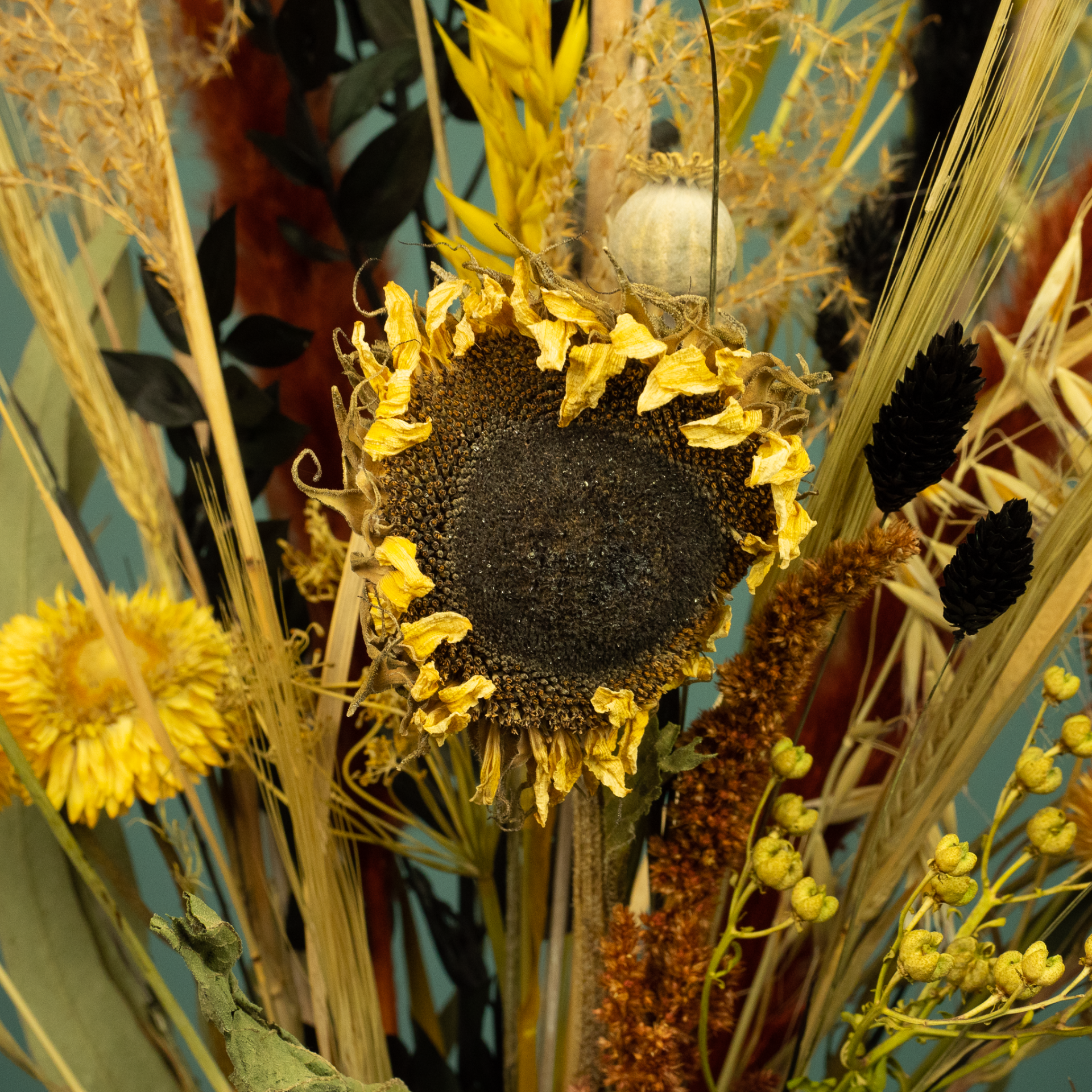 Droogboeket Herfst is een vol en rijk boeket in bruin, zwart en naturel tinten met een vleugje oranje/geel. Het boeket is rond geschikt en kan daarom zowel tegen een muur als midden op tafel neergezet worden. Haal de herfst in huis met dit prachtige boeket!
