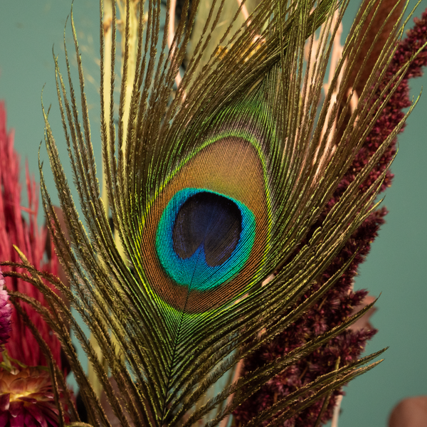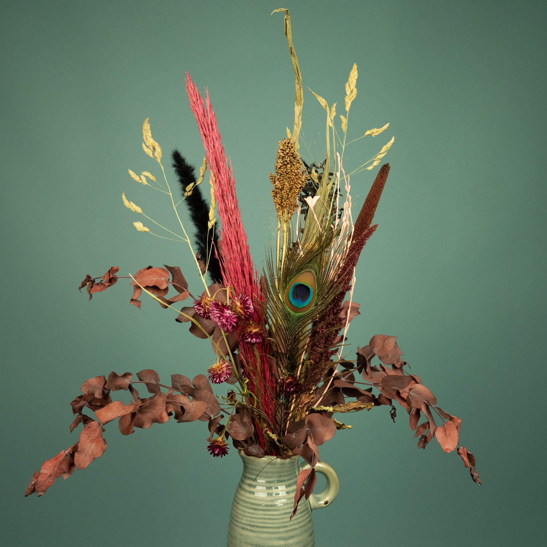 Droogboeket Cerise is een prachtig, weelderig boeket in diep roze en paarse tinten. Door de pluimen en pauwenveer heeft dit boeket een luxe uitstraling.