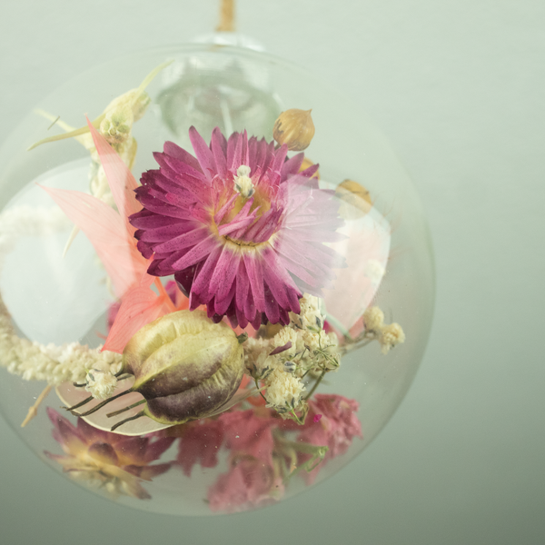 Droogbloemenbal Roze is een glazen bal met een diameter van 8 cm, gevuld met roze en witte droogbloemen. De bal kan opgehangen worden, maar is ook mooi om neer te leggen in een schaal.