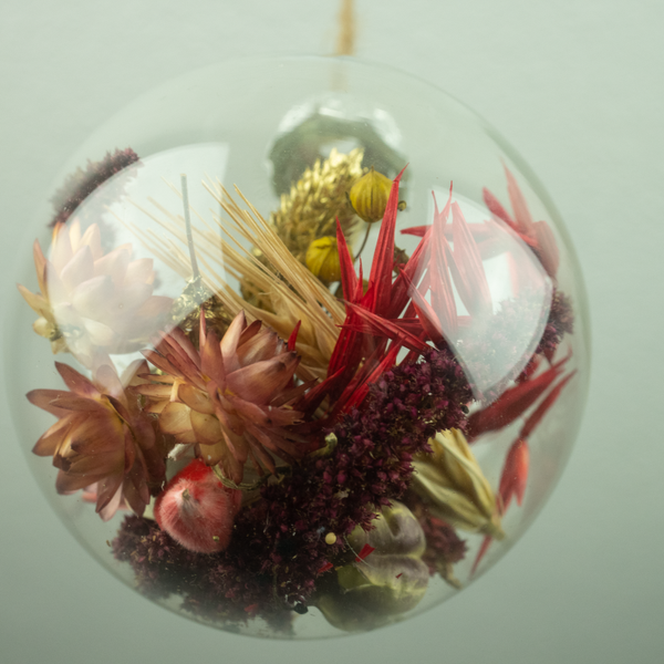 Droogbloemenbal Terra is een glazen bal met een diameter van 8 cm, gevuld met rode, gouden, terra en groene droogbloemen. De bal kan opgehangen worden, maar is ook mooi om neer te leggen in een schaal.