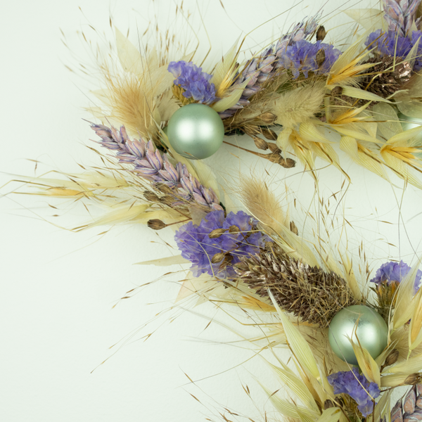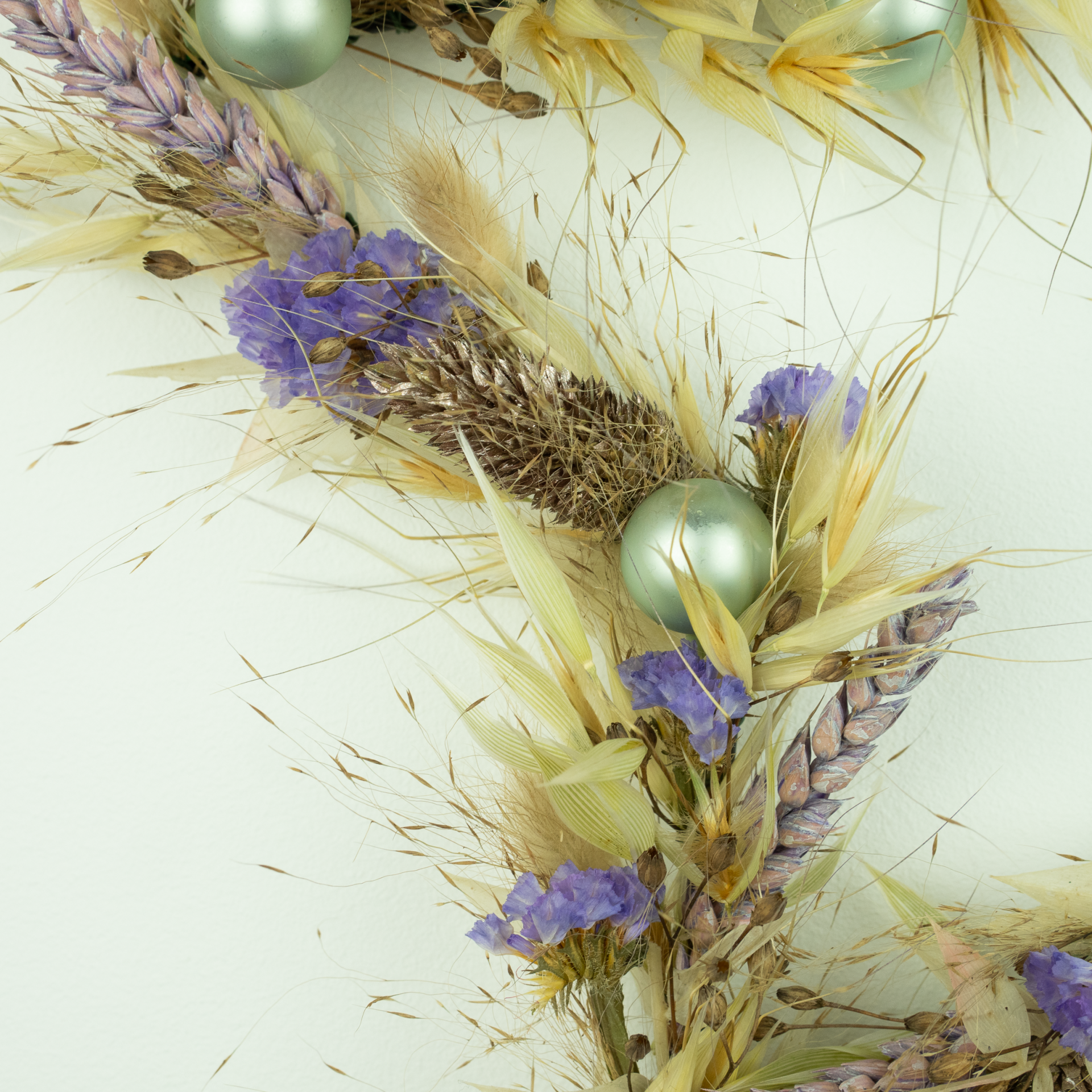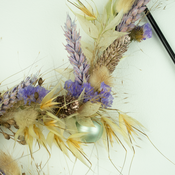 Deze krans bevat: Avena naturel, Limonium lila, Phalaris, Triticum lila, Lagurus naturel, mintgroene glasballetje, diverse grasjes.