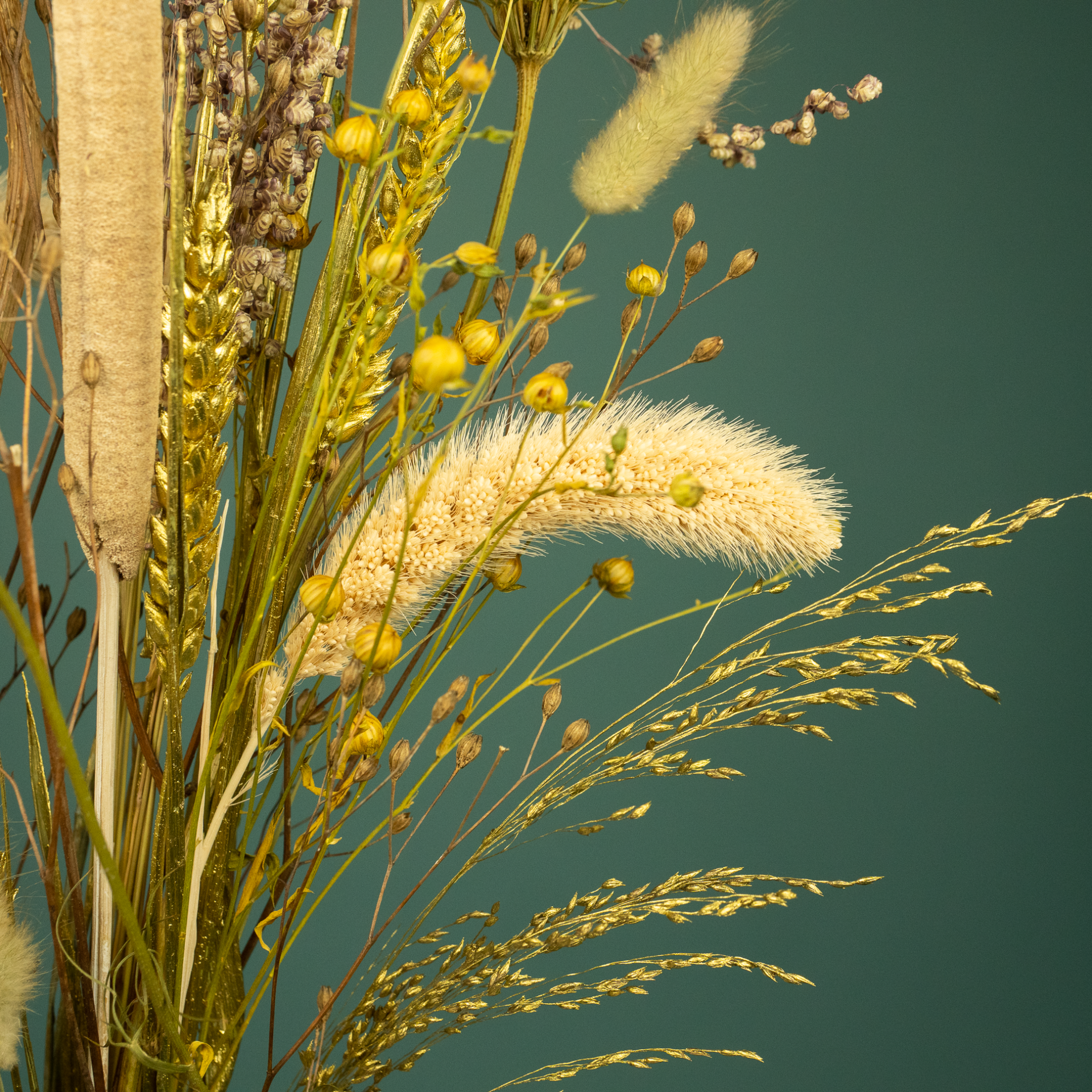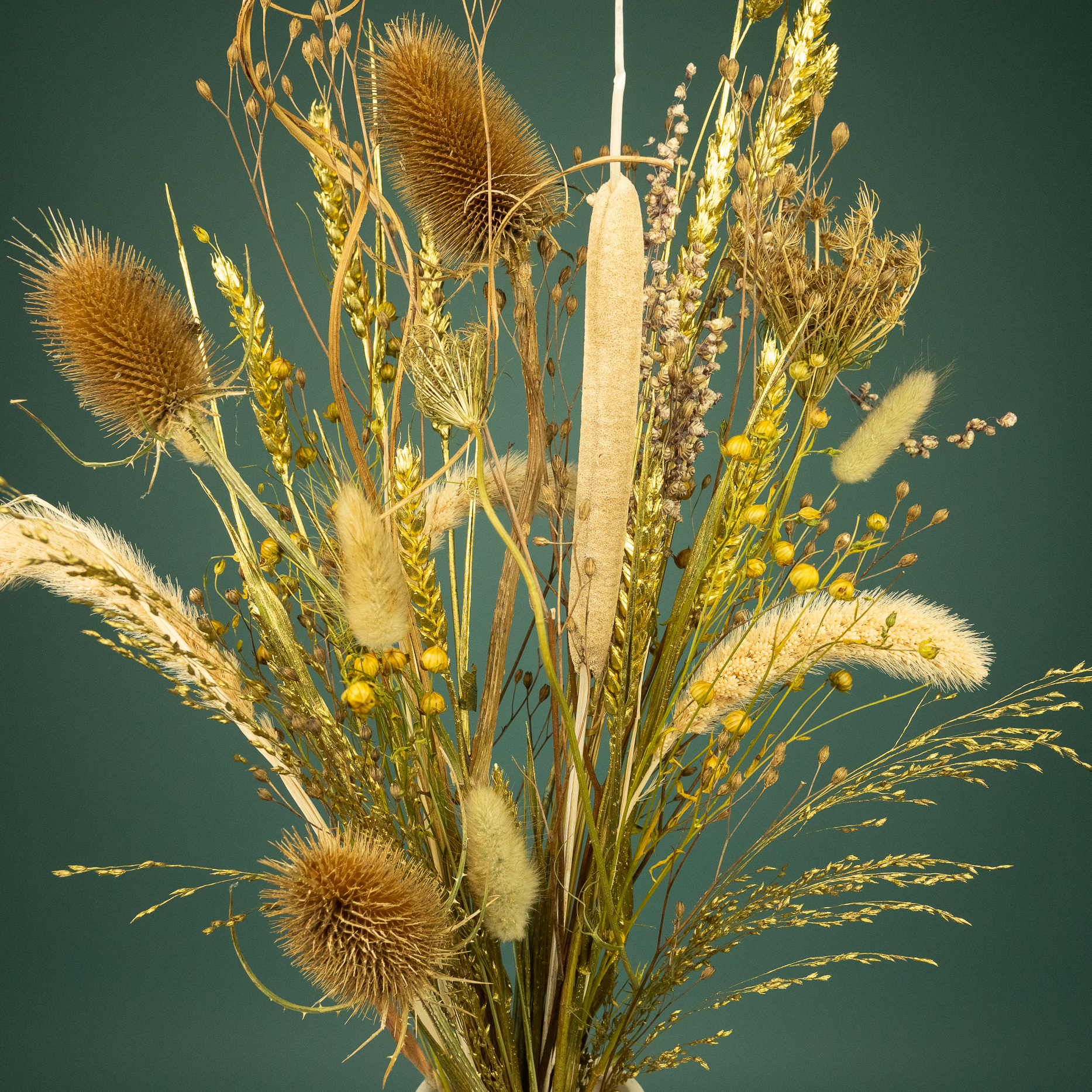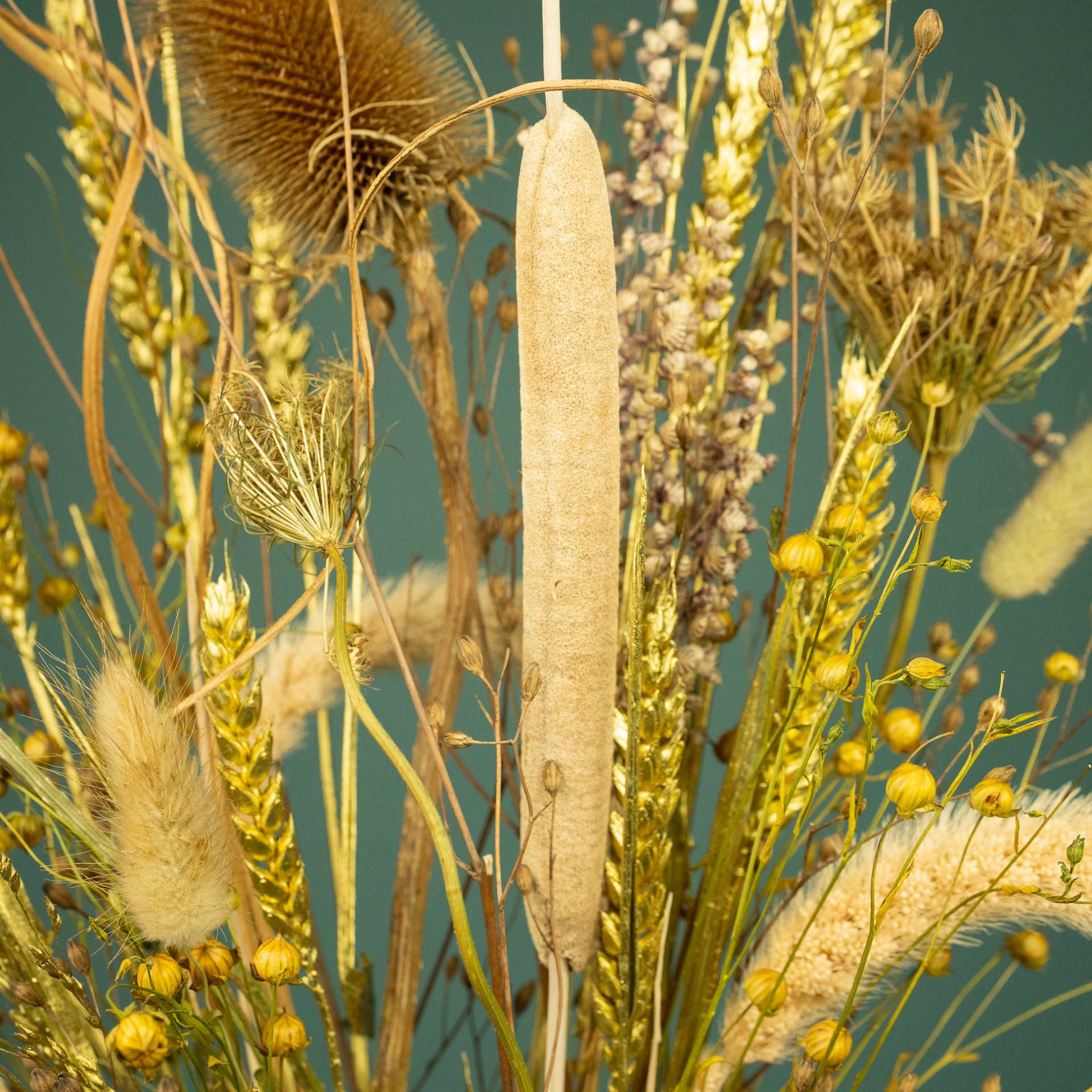 Droogboeket Goud is een sfeervol boeket in warme, natuurlijke kleuren. In de tinten goud, terra, crème en bruin. Het boeket is een echte sfeermaker en heeft een luxe uitstraling door de diverse gouden materialen.