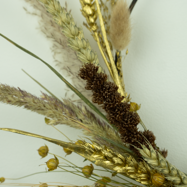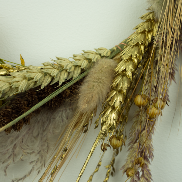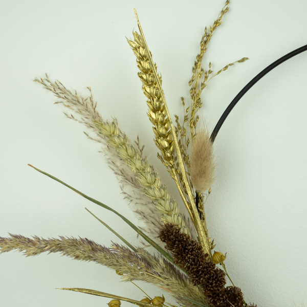 Droogkrans Naturel-Goud is een prachtige, neutrale krans met een luchtige uitstraling door de pluimen en grassen. De toevoeging van de gouden grassen en granen geeft de krans een luxe uitstraling. Door de natuurlijke en neutrale kleuren van de krans, komt deze in vrijwel elk interieur mooi tot zijn recht.