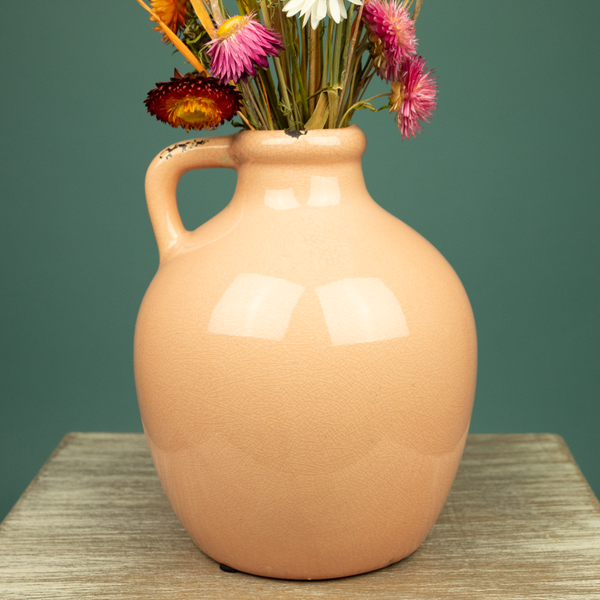Een mooie kruik in zalmroze teint. De kruik heeft een hoogte van 18 cm.