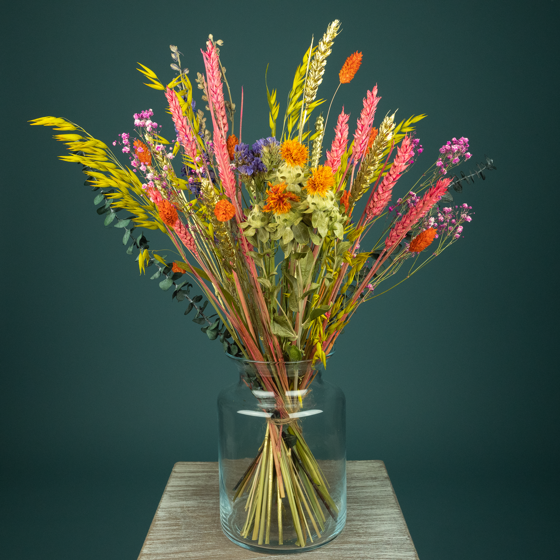 Droogboeket Kleurrijk is een prachtige eyecatcher in diepe, uitgesproken kleurige en gouden tinten. Dit volle boeket kan zo neergezet worden, want wordt geleverd in combinatie met de mooie neutrale glasvaas Bose. Doordat het boeket rond geschikt is, komt het ook midden op tafel mooi tot zijn recht.