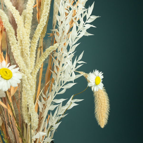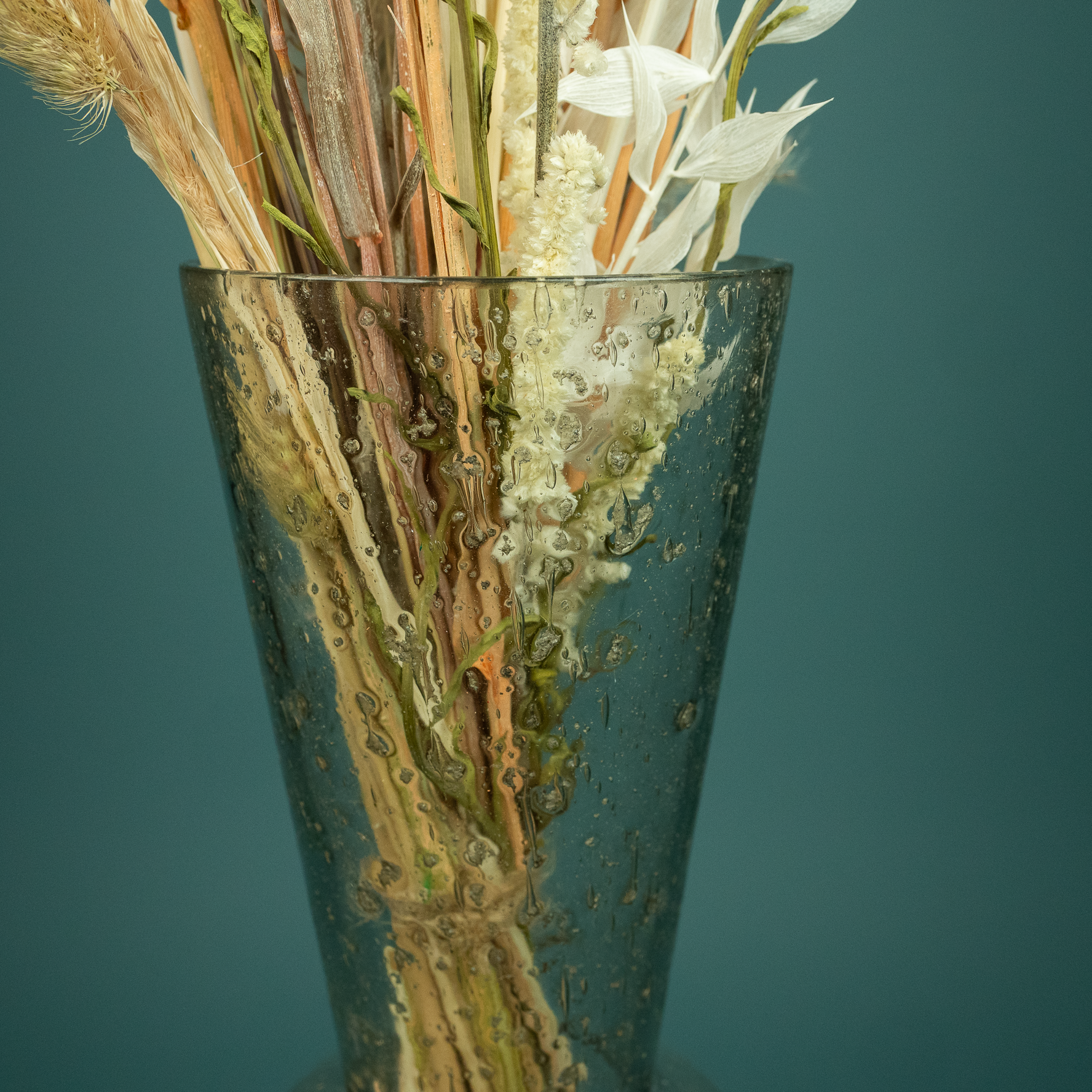 Droogboeket Poedertinten past met haar neutrale uitstraling in vrijwel elk interieur. Dit smaakvolle boeket bestaat uit naturel, wit, crème, zalm, terra en koraalkleurige droogbloemen en heeft een aaibare uitstraling door de diverse zachte pluimen. Vaas Diablo is een mooie doorzichtige vaas van helder steenglas.