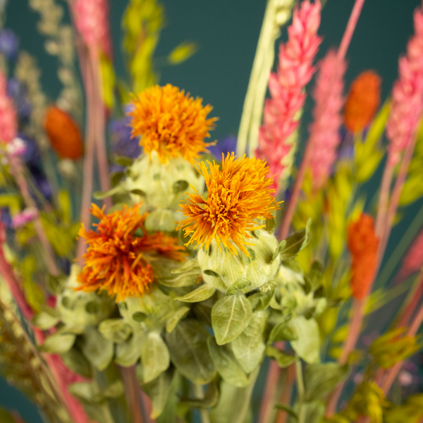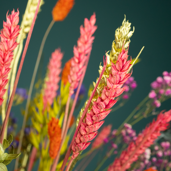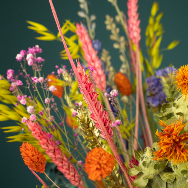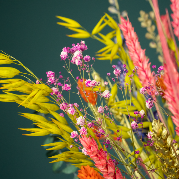 Droogboeket Kleurrijk is een prachtige eyecatcher in diepe, uitgesproken kleurige en gouden tinten. Dit volle boeket is rond geschikt, dus komt ook midden op tafel mooi tot zijn recht.