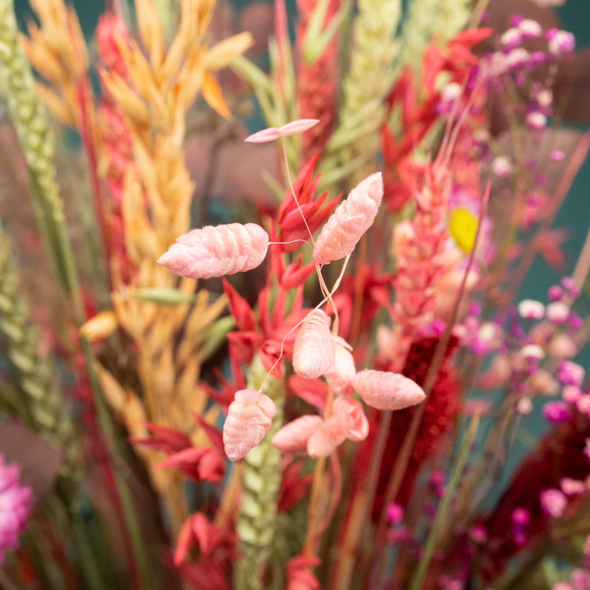 Droogboeket Liefde Large is een prachtig vol boeket in rood en roze tinten met een vleugje groen. Het boeket bevat prachtige materialen, zoals de gepreserveerde rode Eucalyptus en Fluffy pluimen. De roze strobloemen geven het geheel een romantische uitstraling. Het boeket is rond geschikt, waardoor het van alle kanten te bewonderen is en dus ook midden op tafel mooi tot zijn recht komt.