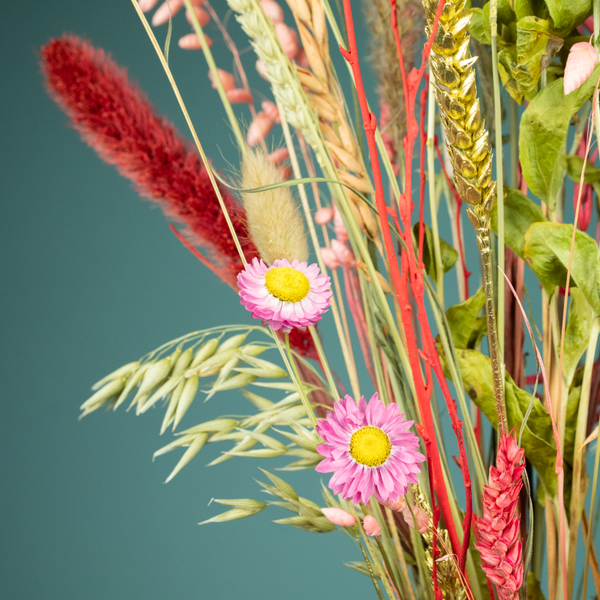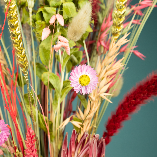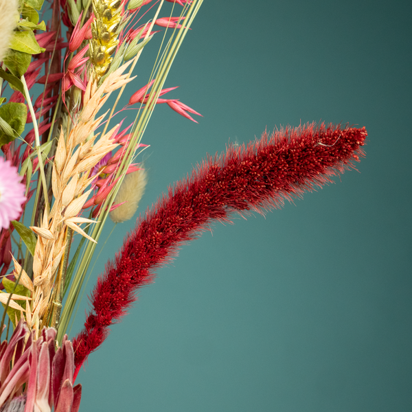 Droogboeket Liefde Medium is een prachtig wat langer en smal boeket in rood en roze tinten met een vleugje goud. Het boeket bevat mooie materialen, zoals de Prothea en Setaria pluimen en past mooi in een wat smallere vaas.