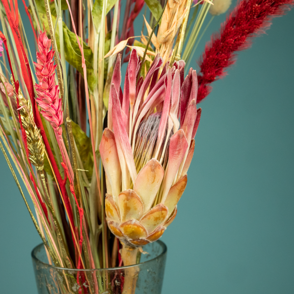 Droogboeket Liefde Medium is een prachtig, wat langer en smal, boeket in rood en roze tinten met een vleugje goud. Het boeket bevat mooie materialen, zoals de Protea en Setaria pluimen en past mooi in een wat smallere vaas. Vaas Diablo is een mooie doorzichtige vaas van helder steenglas.
