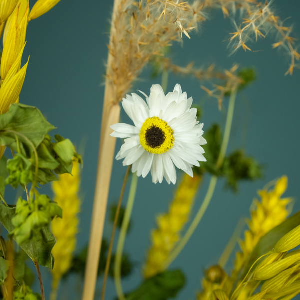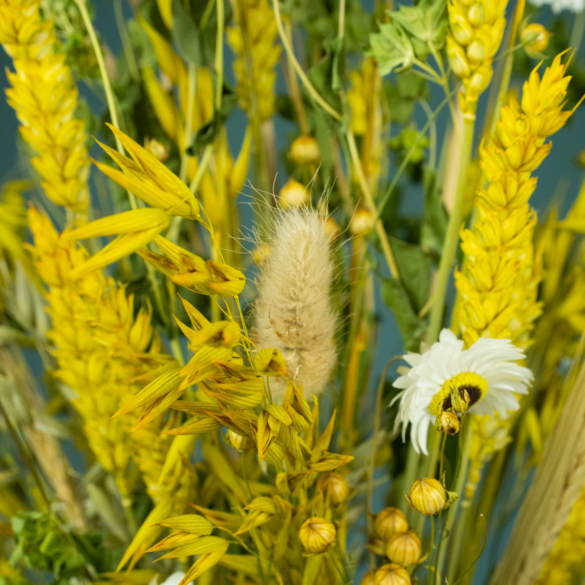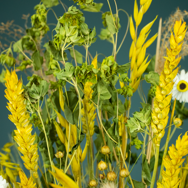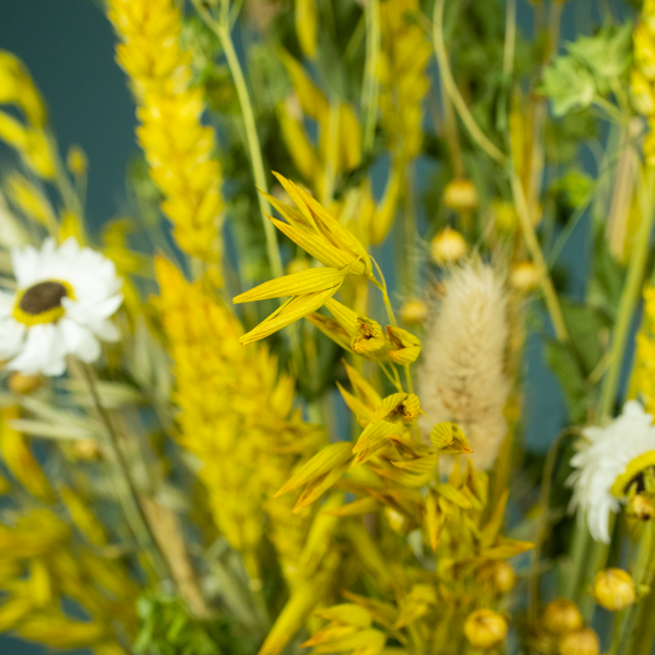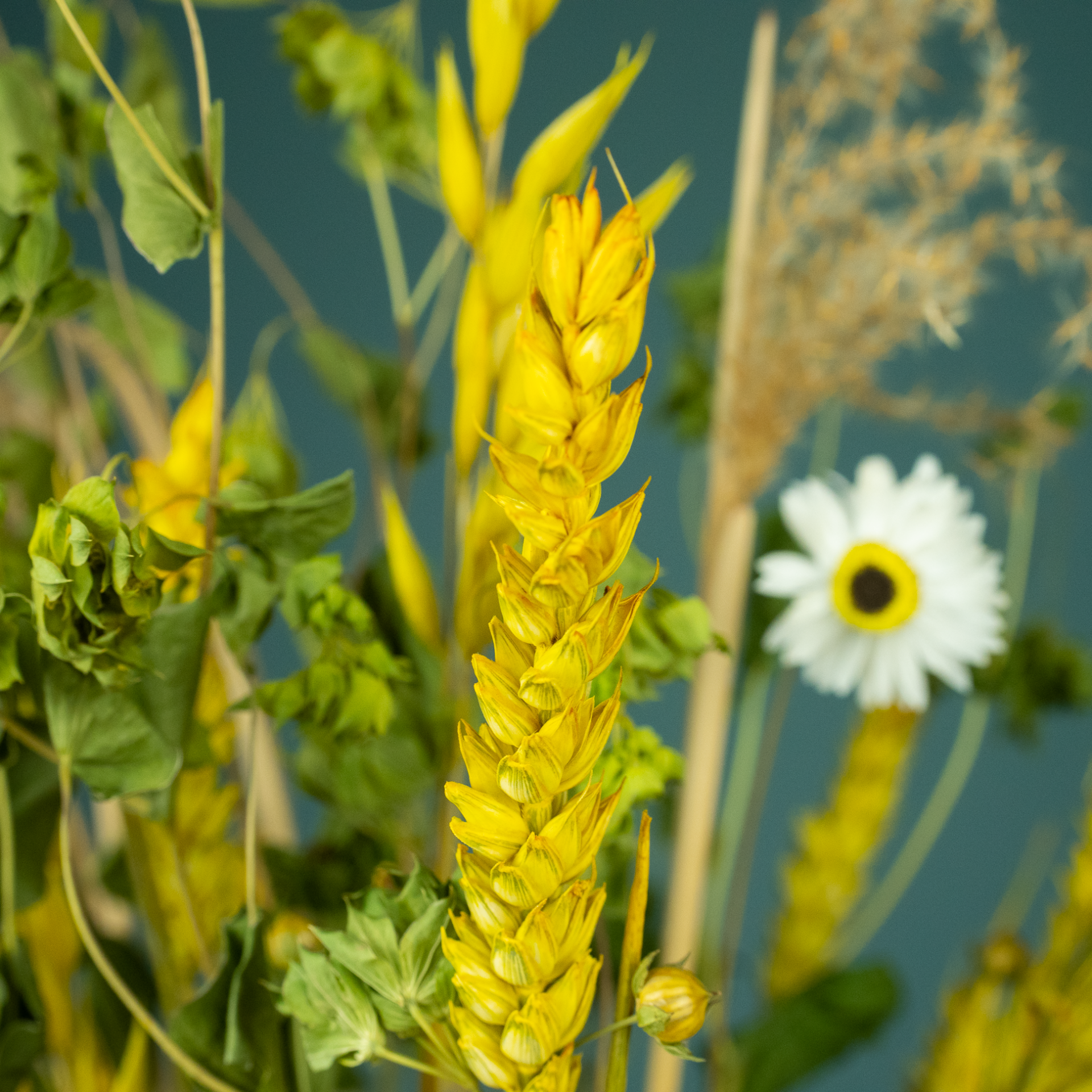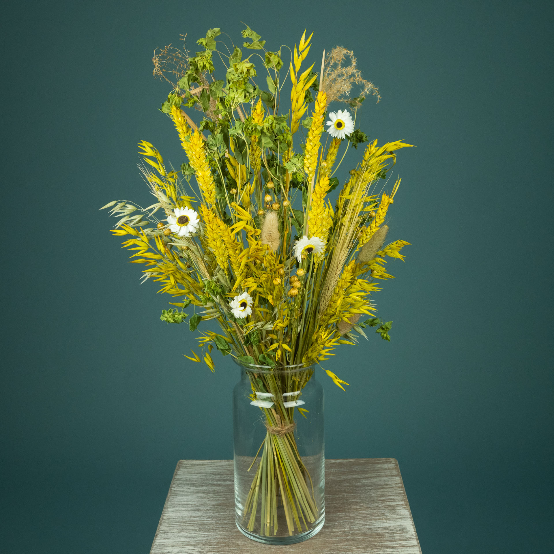 Droogboeket Geel is een mooi vol veldboeket met een natuurlijke uitstraling door de verscheidenheid aan grassen en granen. In de kleuren geel, creme, wit en groen. Het boeket is rond geschikt en komt dus ook midden op tafel mooi tot zijn recht. Vaas Bose smal is een mooie neutrale glasvaas, perfect passend bij het boeket.