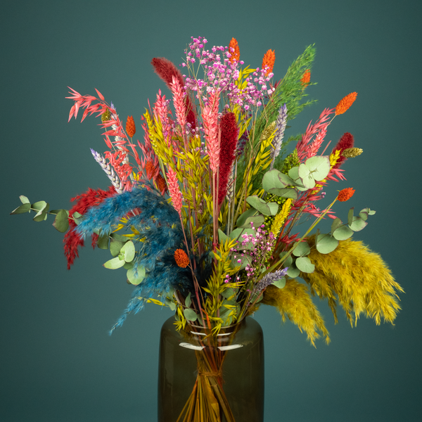Droogboeket Kleurexplosie XL is een echte blikvanger met haar gekleurde fluffy pluimen! Een prachtig vol, weelderig en felgekleurd boeket. Het boeket is rond geschikt en past perfect in Vaas Pip Oker! Deze okerkleurige glasvaas heeft een hoogte van 28 cm.