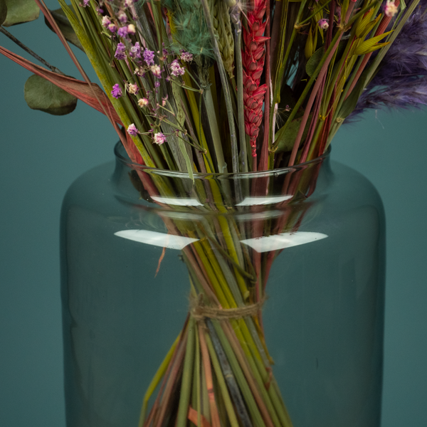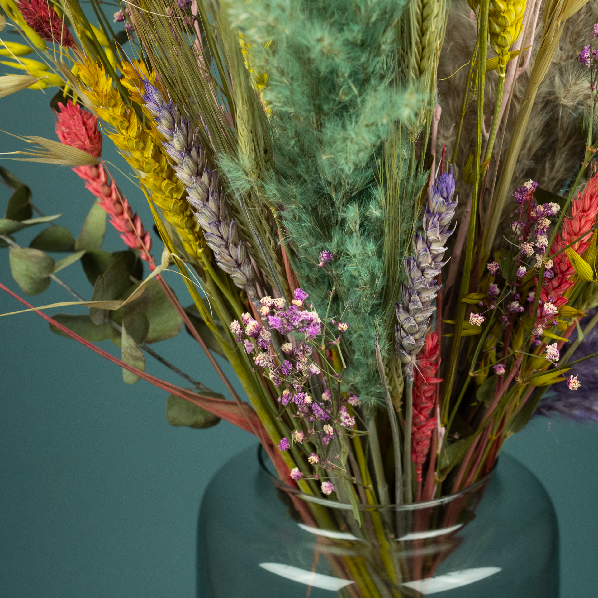 Droogboeket Pastel Extra Large is een prachtig vol boeket, met diverse fluffy pampaspluimen, in mooie pasteltinten. In de kleuren roze, lila, crème en geel. Het boeket is rond geschikt, dus komt mooi tot zijn recht midden op tafel, waar je het van alle kanten kunt bewonderen. Het boeket past perfect in Vaas Pip Oker! Deze okerkleurige glasvaas heeft een hoogte van 28 cm.