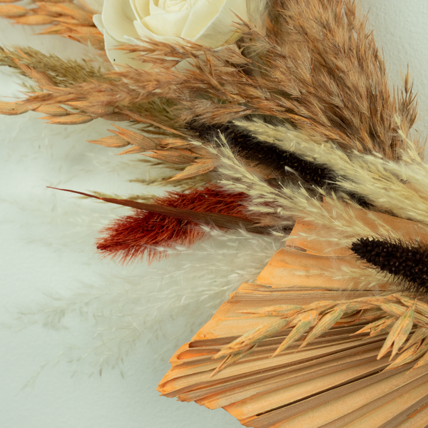 Deze krans bevat: Palmspear Coral Misty, Setaria Burnt Orange, Setaria Deep Brown, Pampas Dadang Gebleekt, Sola Roos 'Bud Roos', Cortaderia, Haver Coral Misty en Lagurus.