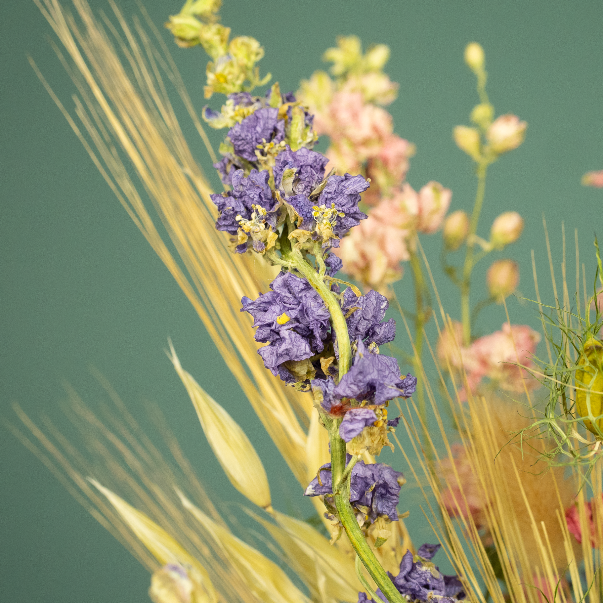 Droogboeket Delphinium is een fijn en neutraal boeket met uitsluitend ongeverfde materialen. De prachtige Delphinium in mooie pastelkleuren geeft dit boeket een lieve en zachte uitstraling. Droogboeket Delphinium wordt geleverd inclusief een mooie, sierlijke ribbelvaas, met een hoogte van 25 cm. De hoogte van het boeket is ongeveer 50 cm.