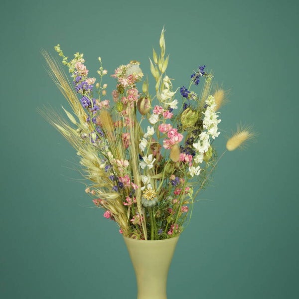Droogboeket Delphinium is een fijn en neutraal boeket met uitsluitend ongeverfde materialen. De prachtige Delphinium in mooie pastelkleuren geeft dit boeket een lieve en zachte uitstraling. Droogboeket Delphinium wordt geleverd inclusief een mooie cremekleurige glasvaas, met een hoogte van 25 cm. De hoogte van het boeket is ongeveer 50 cm.