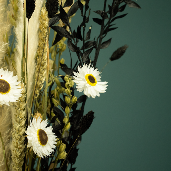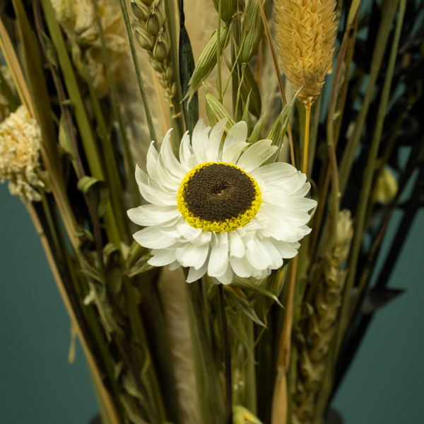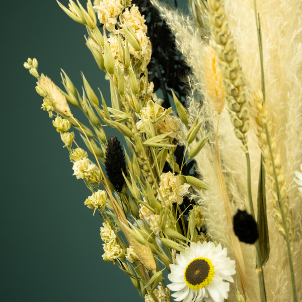 Droogboeket Zwart-Wit is een prachtig natuurlijk boeket. Door haar neutrale kleuren past het droogboeket in vrijwel elk interieur. Het boeket is rond geschikt en past perfect in Glasvaas Taupe. Een prachtige stevige glasvaas met een combinatie van mat en doorzichtig glas.